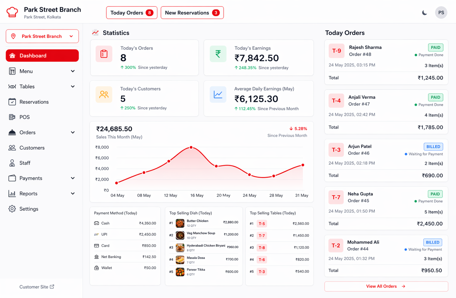 Manage billing, kitchen workflow, inventory, staff, customer orders, and business analytics through one intelligent platform built to streamline daily operations and support long-term restaurant growth.