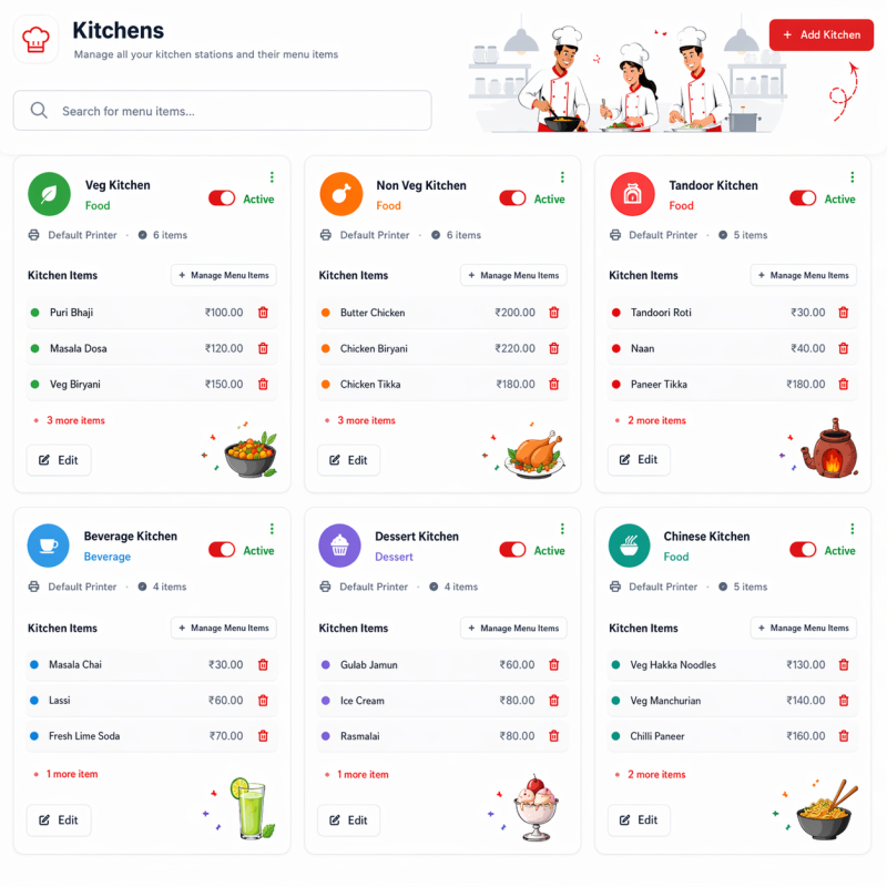 Take full control of your restaurant operations with a centralized multi-kitchen management solution designed for efficiency and scalability. Seamlessly manage multiple kitchen sections—such as veg, non-veg, tandoor, beverages, and desserts—within a single unified platform. Automatically route orders to the respective kitchen, streamline preparation workflows, and reduce delays with real-time coordination. Assign specific menu items to each kitchen, manage printers, and monitor performance across all stations effortlessly. With intelligent segregation and live tracking, your team can operate faster, minimize errors, and deliver consistent quality—no matter how complex your kitchen setup is.