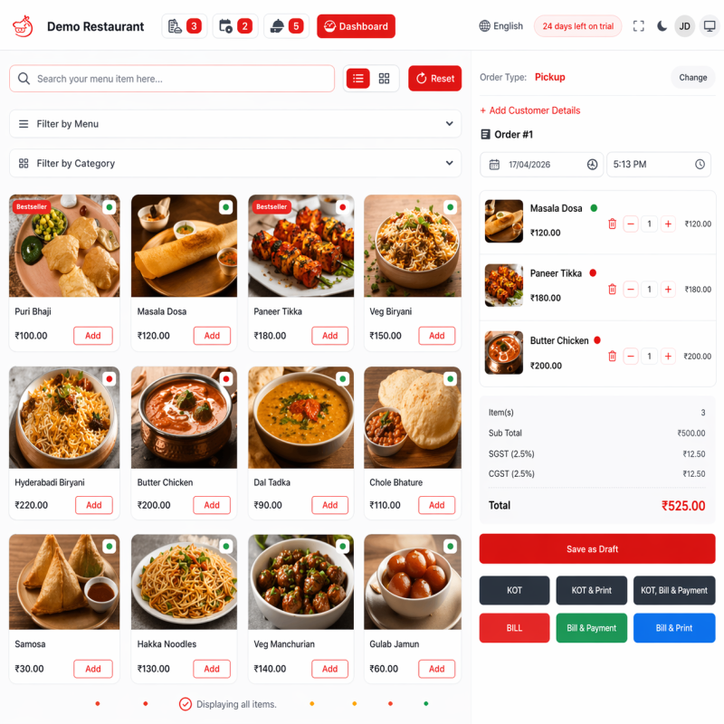 Streamline your restaurant operations with a fast, intuitive, and fully integrated POS system designed for modern food businesses. From order taking to final billing, manage everything seamlessly in one unified platform. Enable quick order processing, real-time billing, and multi-payment support including UPI, cards, and cash—all while maintaining accuracy and speed during peak hours. With intelligent features like live order tracking, GST-ready invoices, and automated calculations, your team can focus more on service and less on manual tasks.